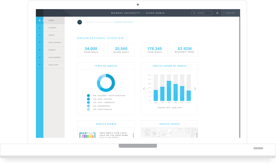 The dashboard lets your team see their group data, such as, total hours served, filter by date, then export.